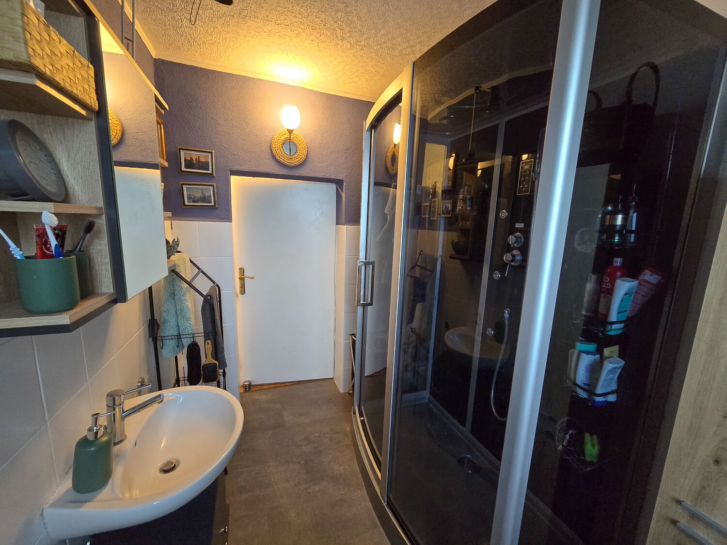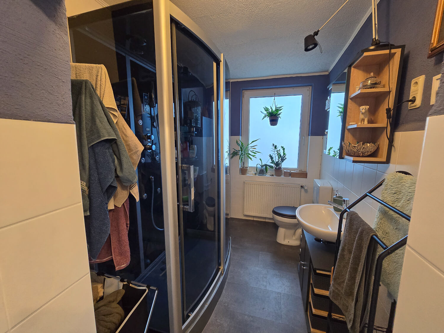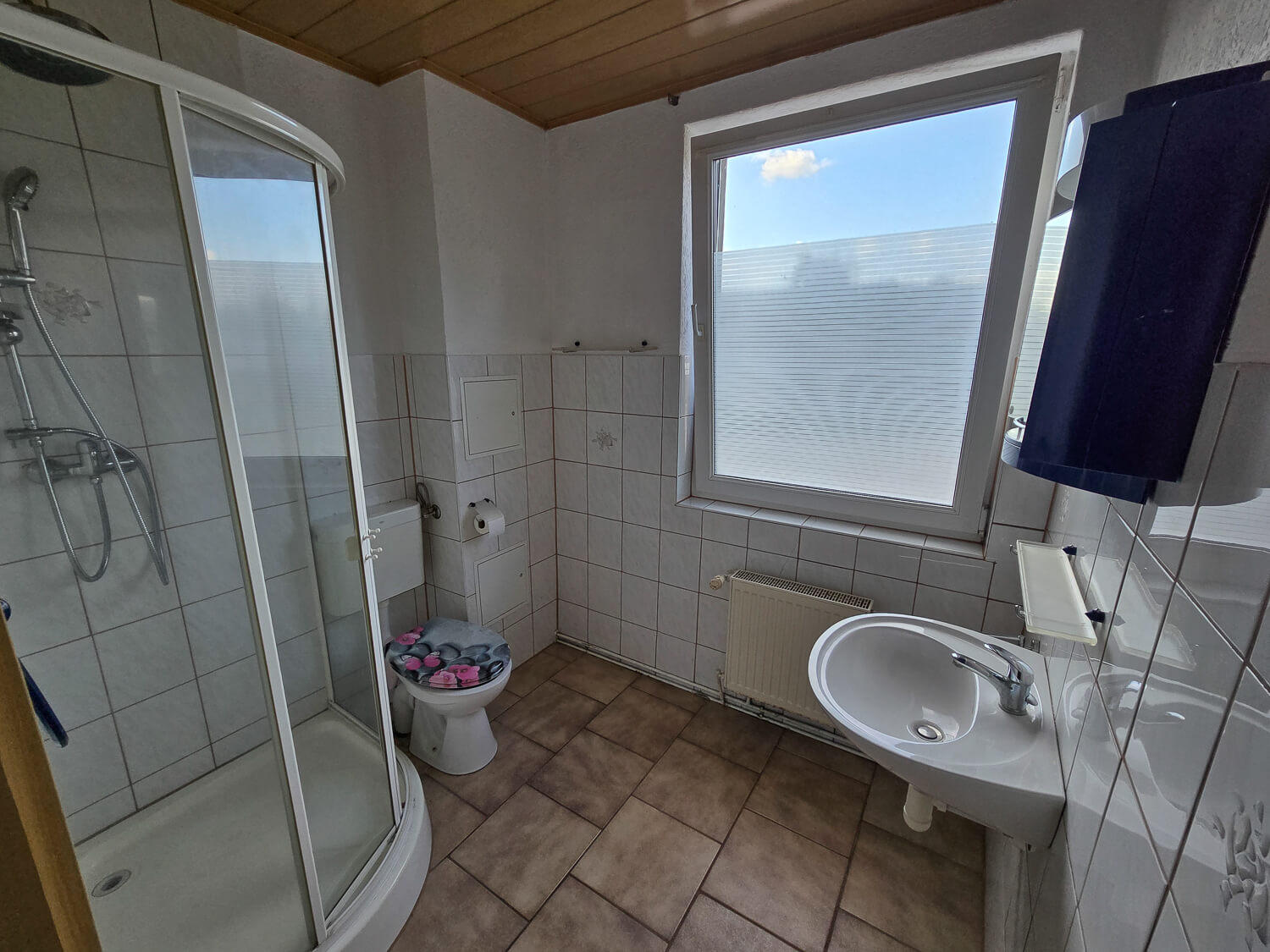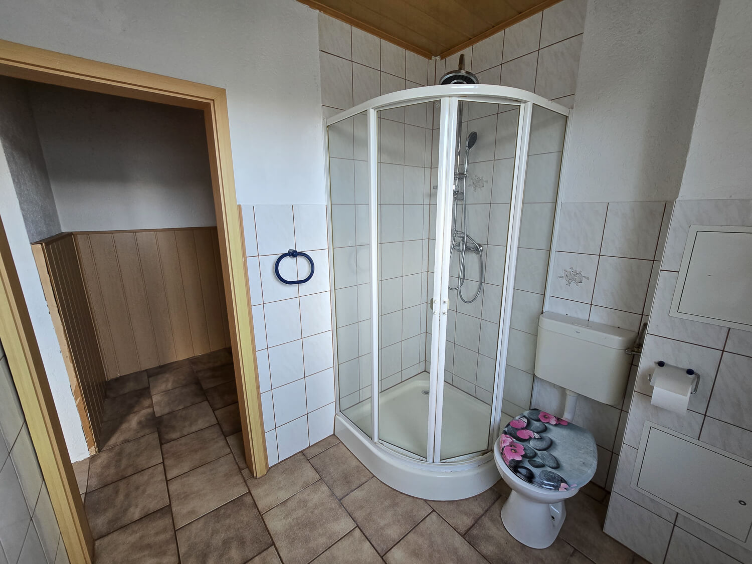 - Bad mit WC, Handwaschbecken und Dusche